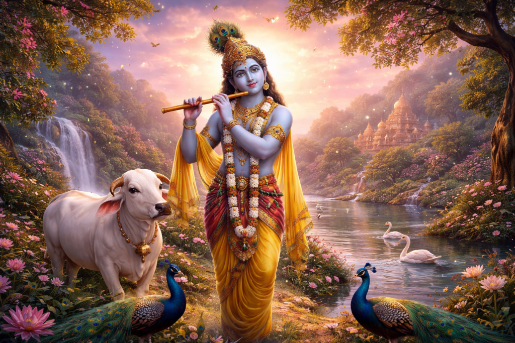 కొలను గట్టు మెట్ల మీదుగా పైకి వస్తున్న నారదుడు, గట్టు మీద తాను ఉంచిన వీణను తీసుకున్నాడు. కాస్త దూరంలో శ్రీకృష్ణుడు నిలబడి ఉండడం అప్పుడు నారదుడు చూశాడు.