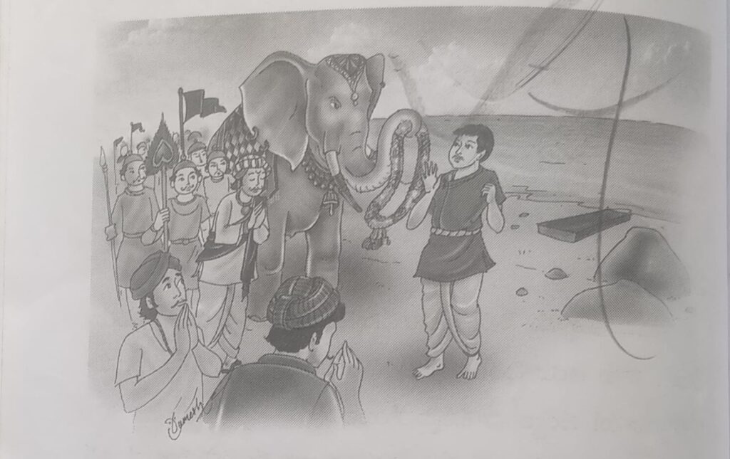 ఇంతలో ఆ ఊరేగింపు బుద్దిమంతుడి వద్దకు వచ్చేసింది. ఏనుగు .అతడి మెడలో మాల వేసి, అతణ్ణి తన తొండంతో పైకెత్తి, అంబారీలో ఆసీనుని చేసింది.